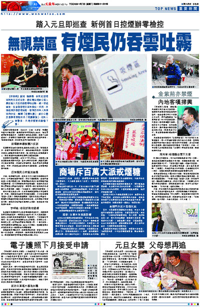 【本報訊】(記者 潘頌禧、李見安)禁煙法例昨日正式生效,衛生署控煙辦公室人員在踏入元旦的凌晨零時出動,經一夜巡查後,在首個禁煙日並無檢控。然而,本報巡視多個禁煙地點,發現仍然有人無視法例存在,繼續「吞雲吐霧」,部分公園及食肆等黑點依然「煙霧瀰漫」,但無人被警告,只是作簡單的勸喻了事。