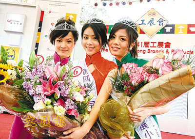 ■工展會重頭戲工展小姐選舉昨揭盅,林彥蹤(中)大熱勝出摘冠,她早前已奪4大獎項,成為五料冠軍;左為亞軍林宜芝、右為季軍盧婉婷。 本報記者梁祖彝 攝