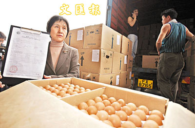 【本報訊】(記者 黃慧珊)首批附衛生證明的內地雞蛋昨日中午從湖北抵港,入口商稱每箱雞蛋的成本上升約6%,下一批來貨將會加價。食物安全專員麥倩屏表示,衛生證明書上會標明雞蛋來源及不含蘇丹紅等證明,但沒規定在雞蛋上印有標記。有立法會議員批評,此舉或可讓不法商人魚目混珠,把未經認可關卡進口的雞蛋「裝扮」成有衛生證明的雞蛋。