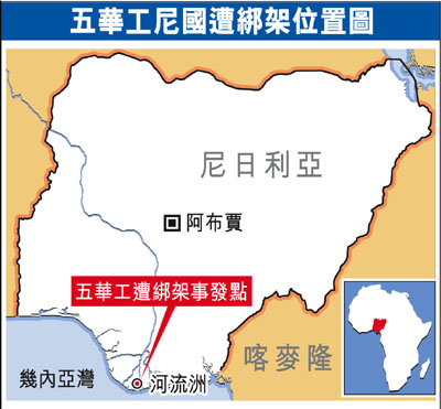 【本報訊】綜合通訊社5日報道:中非國家尼日利亞南部尼日爾河三角洲地區的武裝分子今天綁架了中國某電訊公司的5名工人。初步相信事件不涉及政治目的,綁匪很可能只是為了贖金。目前,使館正在積極同當地政府取得聯繫以參與營救。