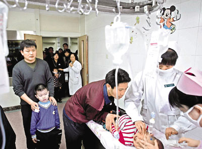 ■近日,北京各大醫院的急診大廳人滿為患,病人以感冒發燒兒童患者居多,北京兒童醫院日門診量則達到了創紀錄的8,000多人次。圖為兒童醫院醫護人員在為患兒輸液,門外則是長長的候診隊伍。 新華社
