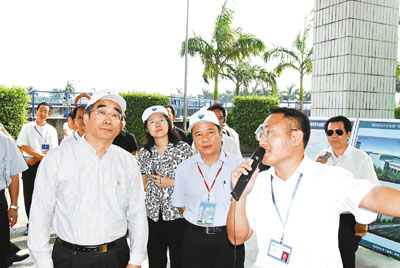 ■國家環保總局污控司司長樊元生(左一)、深圳市副市長呂銳鋒(左三)、深圳市環保局局長郭雨蓉(左二,女)檢查深圳濱河污水處理廠並聽取企業匯報。
