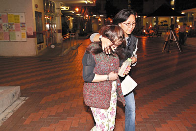 ■竹園南村華園樓一名老婦疑遭劫殺,警方昨將她的媳婦拘捕。圖為涉案婦人於事發當晚被警方帶走助查。 資料圖片
