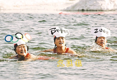 6日,北京延慶舉行冬泳比賽。選手們戴著08奧運標誌頭牌,划開北方冬日刺骨的河水。路透社