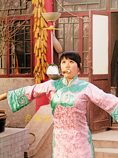 ■雜技小院裡,鍋碗瓢盆都是表演道具。