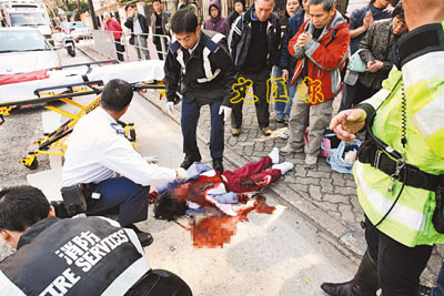 ■女學童被小巴輾至血肉模糊,有途人在旁合十為女童祈禱,盼搶救成功。 本報記者蔣焯文 攝