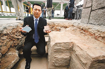 ■建築署總建築師鄧文彬說,在發掘的四個井坑中的其中兩個,發現懷疑是南面正門石階及磚瓦碎片。 本報記者曾慶威 攝