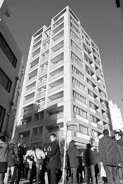 ■記者在殺夫日婦住宅外守候。日婦所住的公寓樓位於東京高檔住宅區。 法新社