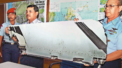 ■印尼搜索小組展示一塊較大的墜機尾部殘片。 法新社