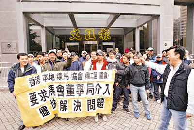 【本報訊】一班本地練馬協會的策騎員,昨午到跑馬地馬會行政大樓外請願,不滿馬會薪酬福利安排,並向馬會代表遞交請願信。本地練馬協會主席洪國興指出,他們已釋出善意,希望管理層有回應,不排除將工業行動升級。馬會回應稱,會跟進協會的要求。