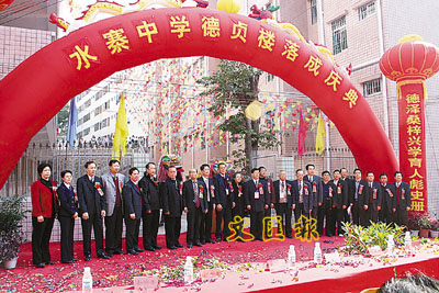 【本報訊】由香港五華同鄉總會周樹箐等20多位鄉賢捐款100萬元興建的水寨中學「德貞樓」,日前舉行落成慶典儀式。全國政協委員、香港梅州聯會會長林光如、廣東省政協常委、香港梅州聯會諮詢會主席余鵬春、香港梅州聯會副會長、香港五華同鄉總會會長周樹箐分別到五華出席慶典儀式,場面熱鬧。