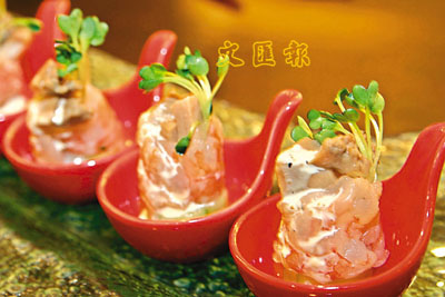 除了主菜之外,冷盤、甜品都有鮑魚做配搭,好像玻璃蝦山椒鮑魚卷,以澳洲海蝦作刺身,配以鮑魚片、蘿蔔苗及青瓜,再塗上一層薄身的沙律醬及輕量黑椒,蘿蔔苗能帶起鮑魚片和海蝦的鮮味,感覺清新爽口。甜品也有鮑魚?不錯,一輪鮑魚戰後,別錯過鮑魚皮蛋酥。吃一口鬆脆可口,除了有鮑魚味之外,還有淡淡的薑味,小小的一件,不太甜或膩,屬驚喜之作。