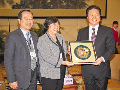 ■湯炳權副省長(右)向訪粵團團長高寶齡(中)、榮譽團長陳鑑林致送紀念品。
