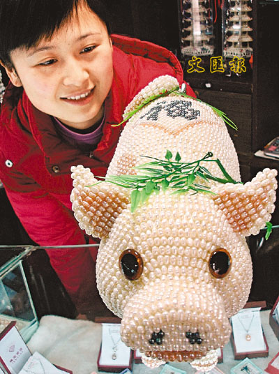 14日,一種由近兩萬顆純太湖珍珠製作的工藝生肖福豬在蘇州市山塘街一家珍珠店上櫃銷售,該款福「珍豬」造型惟肖惟妙,十分逼真。 中通社