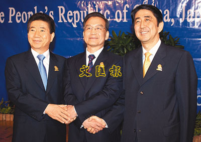 ■第七次中日韓領導人會議14日在菲律賓宿務舉行。圖為溫家寶(中)、盧武鉉(左)和安倍晉三(右)在會談前握手。 法新社