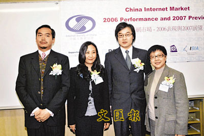 根據有關調查報告,截止06年底,中國互聯網用戶量達到1.36億戶,同比增加22.52%;06年中國個人用於互聯網服務的每月平均消費達169.57元,較05年同期的157.8元增長7.46%;06年中國互聯網總收入達到2767億元,同比上升47%,該調查並預期07年和08年中國互聯網總收入更可分別達到3658億元和4549億元,同比分別增長32.2%和24.36%。