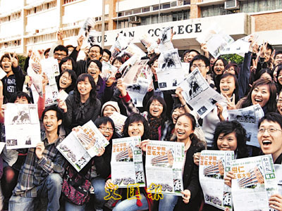 ■商貿小組建議,當局以象徵式地價,撥地予自資開辦的非牟利私立大學,以鼓勵這些院校的發展。圖為本港首間私立大學樹仁大學的學生在歡慶學校正名成功。 資料圖片