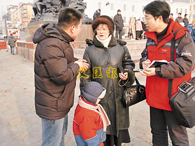 ■俄市民烏麗亞盧芙加娜接受本報記者楊同玉採訪,左一為記者的俄語翻譯張賀。