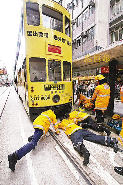 一名尼泊爾籍女子Roka(小圖),昨午3時許疑棄用斑馬線橫過交通繁忙的上環德輔道西,被電車撞倒捲入車底,頭部重傷昏迷。消防員到場用油壓墊升起電車,將其救出送院,情況嚴重。警方初步調查後相信,傷者橫過馬路時肇禍。圖為消防員正在拯救捲入電車底的婦人。 本報記者溫瑞麟 攝