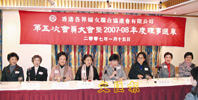 【本報訊】(記者 沈清麗、林志鴻)香港各界婦女聯合協進會(婦協)日前舉行第5次會員大會暨2007至08年度理事選舉。大會共選出了51位新理事,並於本月22日選舉新一屆執委會。主席林貝聿嘉回顧了去年所取得的成績,並展望2007年該會的工作計劃。
