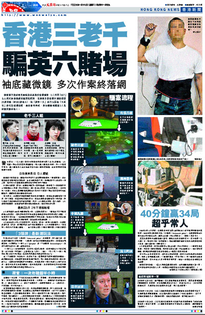 倫敦警方偵破歷來最精密的高科技賭場騙案,3人利用「007」占士邦式微型鏡頭拍攝荷官底牌,在倫敦多家賭場共騙取超過25萬英鎊(約382萬港元),但「萬無一失」的方法因為「太成功」而引起賭場懷疑,最終事敗罪成,有台灣傳媒報道3人是旅居英國的港人。
