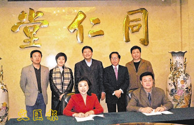 ■李嘉音董事長(前排左)與同仁堂集團總經理梅群(前排右)在同仁堂董事長殷順海(後排中)、副總經理丁永玲(後排左二)等人見證下簽署合作協議。