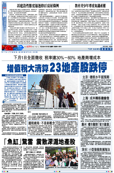 【本報北京新聞中心記者海巖17日電】中央調控內地房地產市場再出招。國家稅務總局16日發佈通知,要求從2月1日起對房地產項目全面實施土地增值稅清算管理,房地產企業要為開發項目繳付30%至60%的土地增值稅。在地價日益上漲的今天,該項政策將會大大增加包括港商在內的地產商囤地和開發成本。受此調控消息衝擊,周三滬深兩市地產指數均在開盤後一路下挫,跌幅逾9%,其中跌停股票更逾20隻。在本港上市的內地地產股亦普遍下挫,錄得5%至8.5%的跌幅。