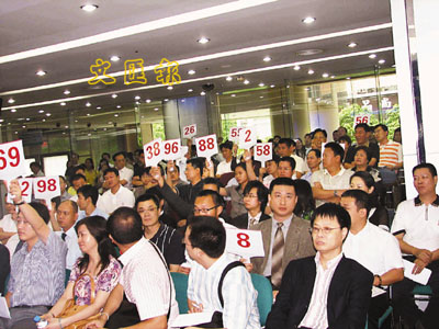 ■開發商積極搶地,但一旦到手卻往往囤積而不開發。圖為深圳土地拍賣會。 資料圖片