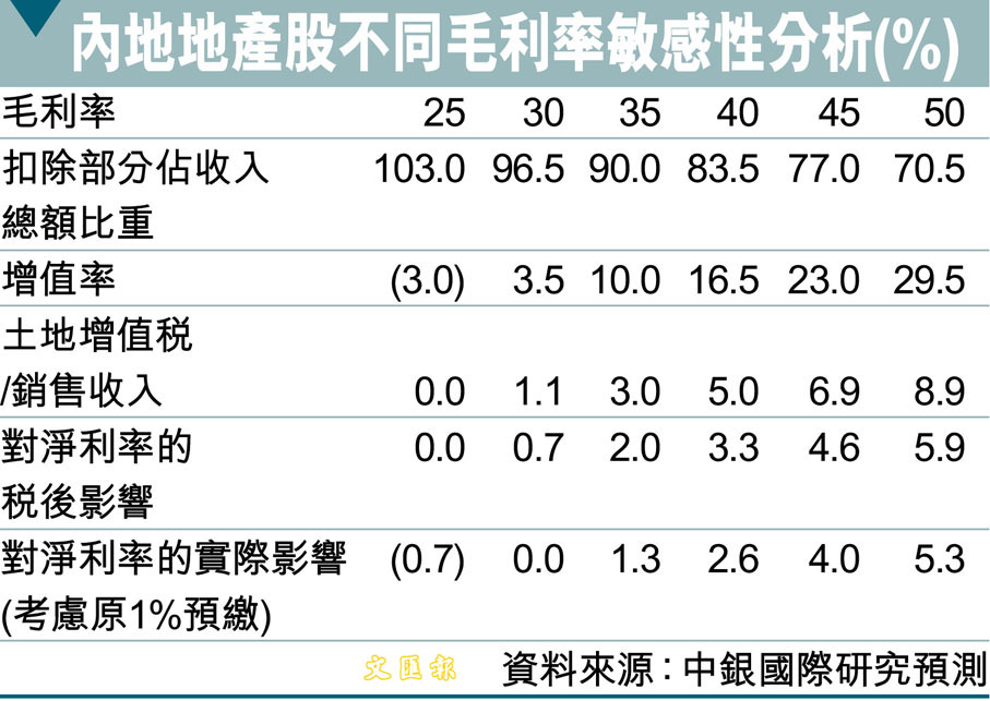 內地地產股不同毛利率敏感性分析(%) (圖)