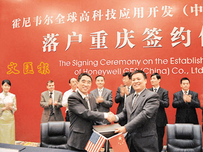 ■霍民韋爾與重慶方面日前正式簽約,在重慶設立霍尼韋爾全球工程技術中心。 本報記者徐家強 攝
