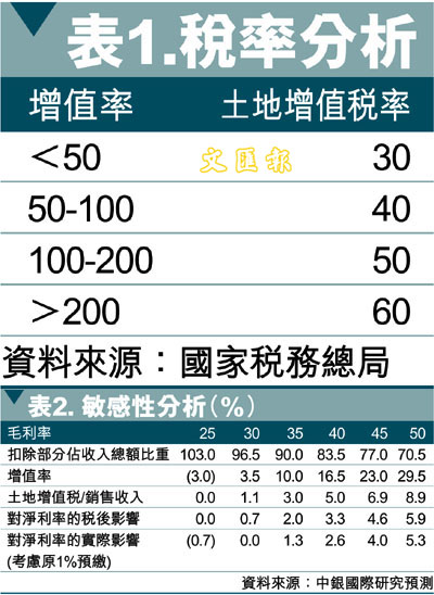 【本報訊】據中銀國際報道,近日國稅總局發佈《關於房地產開發企業土地增值稅清算管理有關問題的通知》 (《通知》),意在嚴格執行1993年出台的《中華人民共和國土地增值稅暫行條例》(《條例》)。根據《條例》規定,土地增值稅主要針對出讓國有土地使用權、房產及其附屬設施的單位和個人所得收益徵收(具體的徵收稅率詳見表1)。但是,該政策自出台以來就面臨執行難的問題。