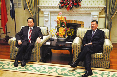 ■昨日,澳門特區行政長官何厚鏵在特區政府總部會見來訪的河南省委書記徐光春(左)一行。 新華社