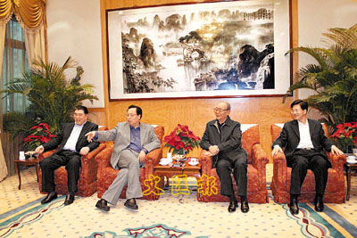 ■徐光春(左二)、李成玉(左一)昨率團拜訪外交部駐澳特派員公署,與萬永祥(右二)等會談。 本報澳門傳真