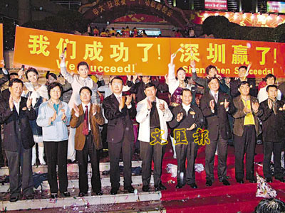 ■深圳獲得2011年第26屆世界大學生夏季運動會主辦權,深圳龍崗區政府、市民歡呼慶祝。 本報記者羅珍 攝