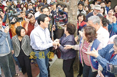 ■馬英九希望握遍全台民眾的手,但「親切不足」,惹人詬病。 資料圖片