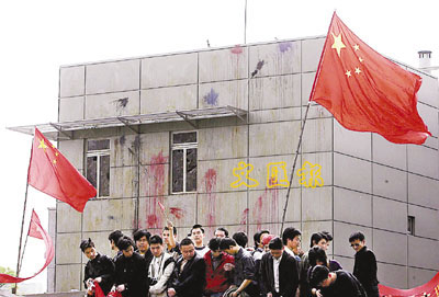 ■2005年4月,日本駐上海領事館被示威者投擲雜物。資料圖片