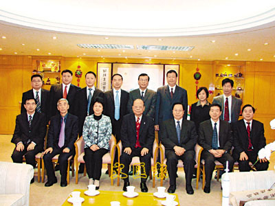 ■河南省政府代表團昨晨拜訪金利來集團董事長、人大常委曾憲梓,受到熱情接待。曾憲梓(前排中)與中共河南省委書記徐光春 (右三)、河南省副省長孔玉芳(左三)等一行於董事長辦公室合照。