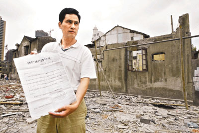■上海近二千名居民曾入稟法庭,控告周正毅為了旗下一個發展項目,在賠償不足甚至欠奉的情況下逼居民遷出。圖中的上海居民展示周氏一上海發展項目的拆卸房屋授權書。 資料圖片