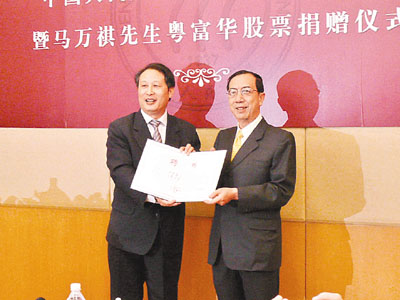 ■馬萬祺之子、全國工商聯副主席馬有禮(右),接受中國人民大學黨委書記程天權頒發捐贈證書。