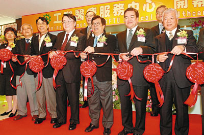 工聯會工人醫療所於中環設立「工聯醫療服務中心」,為該區工作的白領階層及市民提供優質中醫、X光化驗及健康檢查服務,配合多元化的體重控制、都市慢性病調理等計劃,構成完善保健服務組合,既擴展工聯醫療的服務網絡,也致力為繁忙的都市人調適健康的均衡發展。該中心昨開幕,由醫管局主席胡定旭、衛生署長林秉恩、中聯辦社工部副部長黃清芳、中醫藥管理委員會主席范佐浩及工聯會理事長黃國健主禮。 本報記者李志樑 攝
