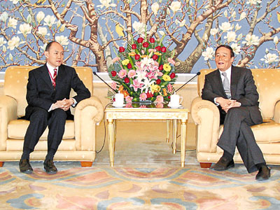 ■北京市市長王岐山(右)與中總會長霍震寰會談。