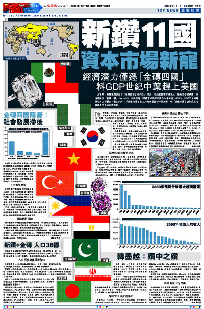 「金磚四國」(即巴西、俄羅斯、印度和中國)過去5年的經濟成就有目共睹,令高盛分析師的聲譽更隆。因此,高盛一年前用相同的預測模型,選出經濟潛力僅遜於金磚四國的11個新興市場,包括墨西哥、印尼、尼日利亞、韓國、越南、土耳其、菲律賓、埃及、巴基斯坦、伊朗和孟加拉,統稱為「新鑽11國」(簡稱N-11)。