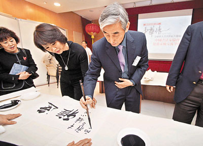 在落筆之前,他首先小心檢視早已準備好的墨水,一試之下發覺墨水略顯過多過稠。事事講究親力親為的張海並沒有「假手於人」,而是自行把原有的墨水減半,並且加水「溝稀」,再行試筆感到稱心如意後,才「大筆一揮」,揮灑自如地寫出「一柱擎天」4個大字。隨後,張海換上較幼細的毛筆,題寫落款,並蓋上印章。此時,全場響起熱烈掌聲。 ■本報記者 郭曉樂