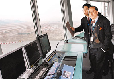 ■曾蔭權表示,香港一定要爭辦世界一流的機場。圖為他昨天參觀機場控制塔台,了解航空管制情況。