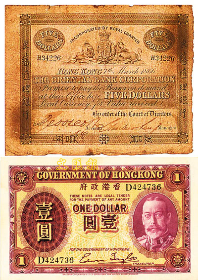 另外,匯豐銀行於1872年獲政府授權發行$1面額紙幣,與銀幣一起流通。1935年後才改由政府發行。(圖下)