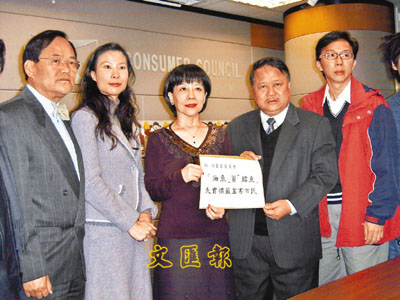 ■立法會議員黃容根(右二)、李國英(左一),昨會見消委會,要求動用消費者訴訟基金,替苦主追討賠償。本報記者梁嘉儀 攝