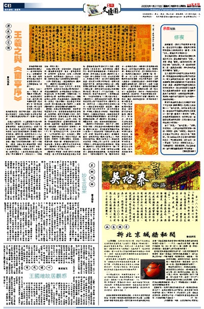 《蘭亭序》存世的摹本、刻本不少,清乾隆四十四年,將收藏於內府的蘭亭摹本御刻為《蘭亭八柱帖》。其中唐虞世南臨本列為「八柱第一」,因為帖末有「臣張金界奴上進」七字,亦稱「張金界奴上進本」。唐褚遂良臨本、被乾隆列為「蘭亭八柱第二」。馮承素摹本被列為「蘭亭八柱第三」,因為此摹本首部有「神龍二字」左半印,故而又稱「神龍本」,原件藏於北京故宮博物院。黃絹本《蘭亭序》,因為它的第四行中「領」字頭上加有「山」字,世稱「領字從山本蘭亭」,據說也是褚遂良所臨。此外還有陳鑒摹本、「雙鉤本蘭亭序」等。蘭亭的刻本中,最早是定武本,相傳是以歐陽詢臨本摹勒上石,北宋時在定武發現,故名。熙甯年間,薛師正出守定武,其子薛紹彭另刻一石,而將原石攜去長安,並鑿損「湍、流、帶、右、天」五字,以有別於翻刻本。定武蘭亭的拓本有幾種,如元代吳炳藏本、元柯九思藏本,元獨孤長老藏本,清乾隆時歸譚祖綬收藏而遭火焚,殘存若干,故稱「火燒蘭亭本」,趙子固藏本,趙乘船時忽遇風浪覆舟,差點喪命,但蘭亭未損,稱「落水本」。在這些摹本、刻本中,馮承素的摹本因是鉤摹,忠於原作,可說比較接近真跡。現在蘭亭右軍祠中陳列了多種《蘭亭序》的摹本、臨本,給書法愛好者、研究者提供了集中觀賞天下第一行書風貌的絕好機會。還有歷代書法家臨摹《蘭亭序》的刻石,其中元代書法家趙孟頫和當代書法家沈尹默的臨本,特別引起我的注意。他們當然都著意臨摹王右軍的筆意,但也自然流露出自己的書風,給人精彩紛呈的感覺。