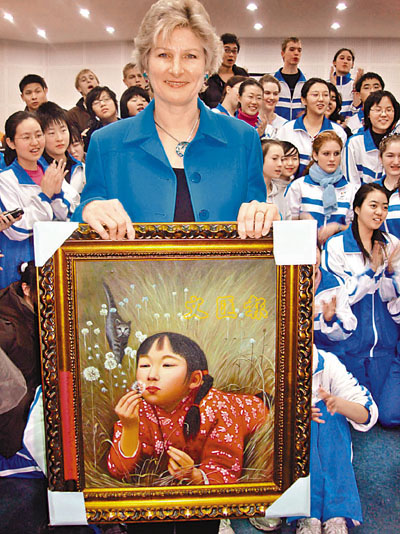 ■休斯日前在北京訪問期間,曾到北京師範大學第二附屬中學與中、美學生進行交流活動。該校老師向其贈送一幅繪畫作品。 資料圖片