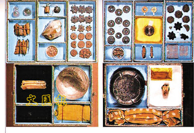 ■二、四層主佛像內發現的兩個銀盒,內藏七寶。