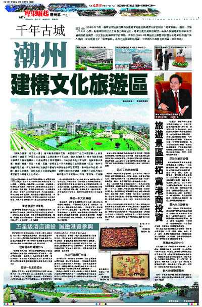 引言 06年9月下旬,廣東省在汕頭召開的促進粵東地區加快經濟社會發展的「粵東會議」,猶如一支強心劑,給粵東四市注入了新動力和新活力,粵東正處於起飛的前夜。為深入報道粵東四市對未來崛起的戰略構想,以及由此給港商帶來的商機,本報於06年12月開始派出高層採訪團分赴粵東四市進行深入採訪,並先後推出了「粵東崛起」系列之汕頭篇和汕尾篇,今明兩天又將推出潮州篇,敬希垂注。
